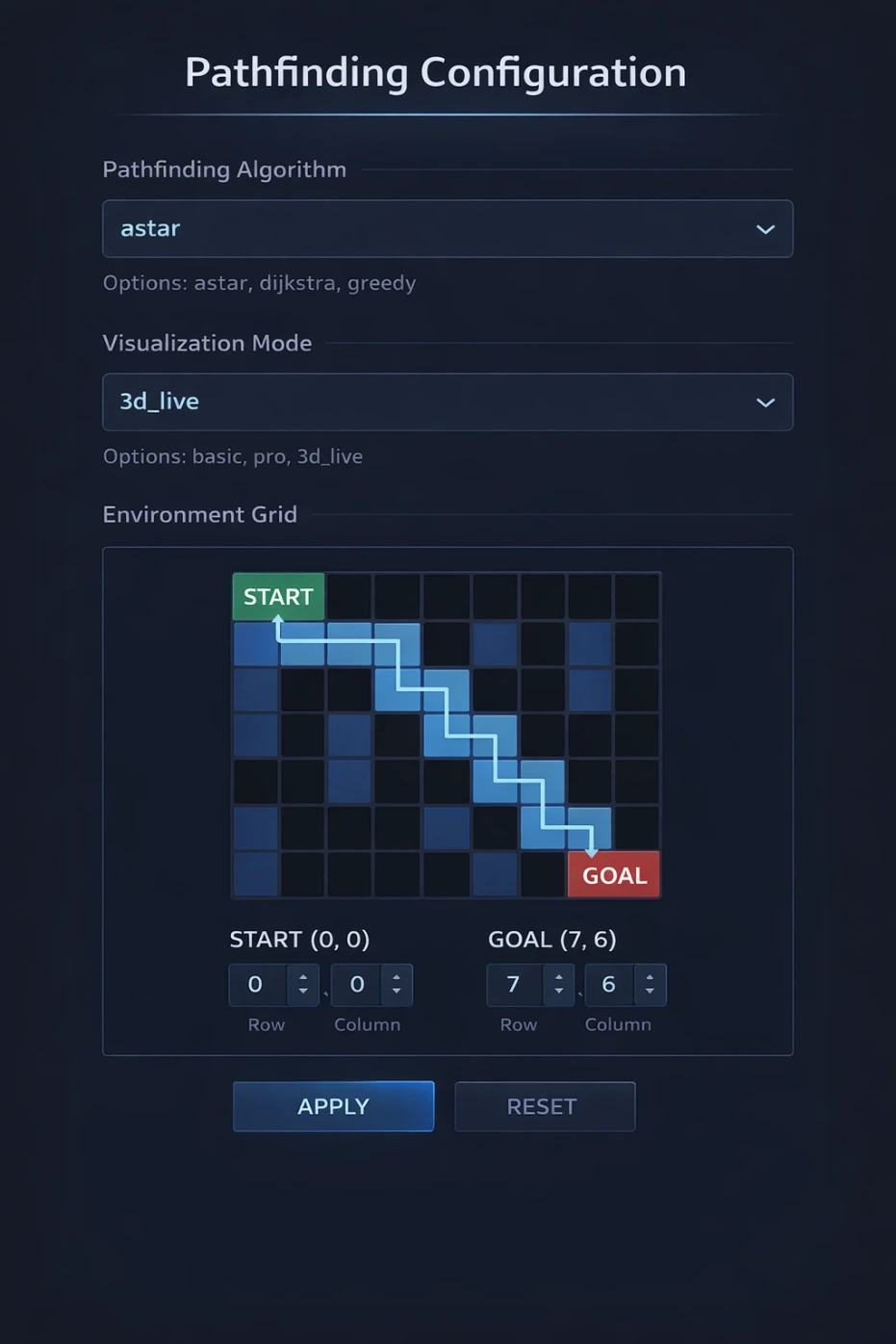 An intelligent pathfinding system that navigates a robot through obstacles using classical AI search algorithms — with real-time 3D visualization that lets you watch the algorithm explore, decide, and move step by step.