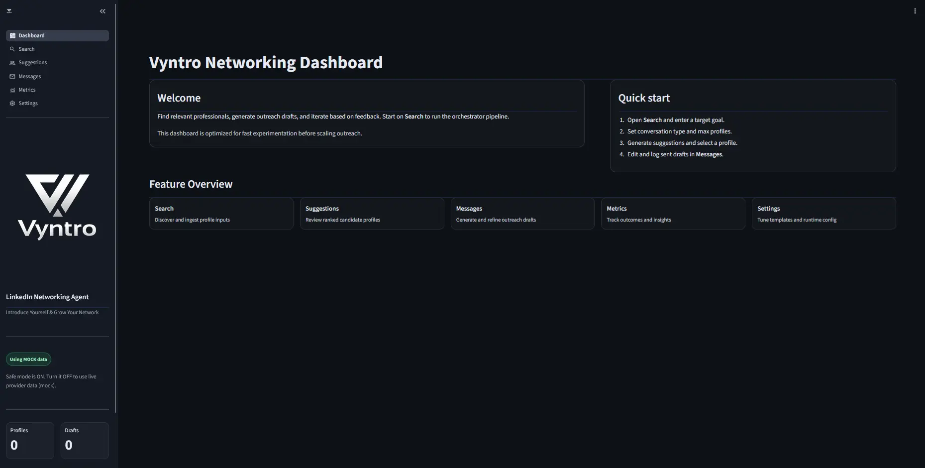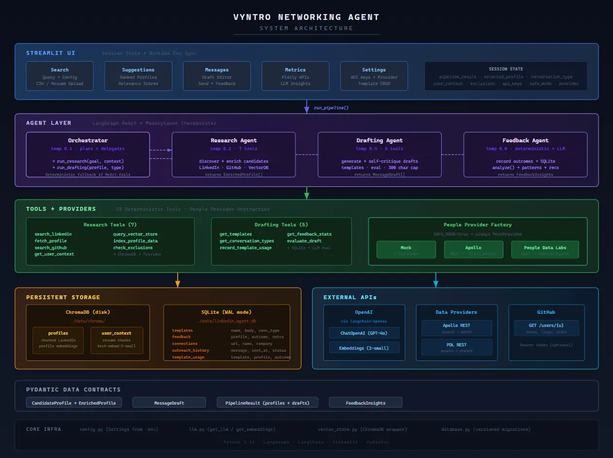 Vyntro is an end-to-end networking copilot. You tell it who you’re looking for, and autonomous AI agents handle the rest: searching for candidates, enriching profiles with live data, scoring relevance, and generating personalized intro messages using your resume and context as a foundation. A feedback loop tracks outcomes so the system improves over time.