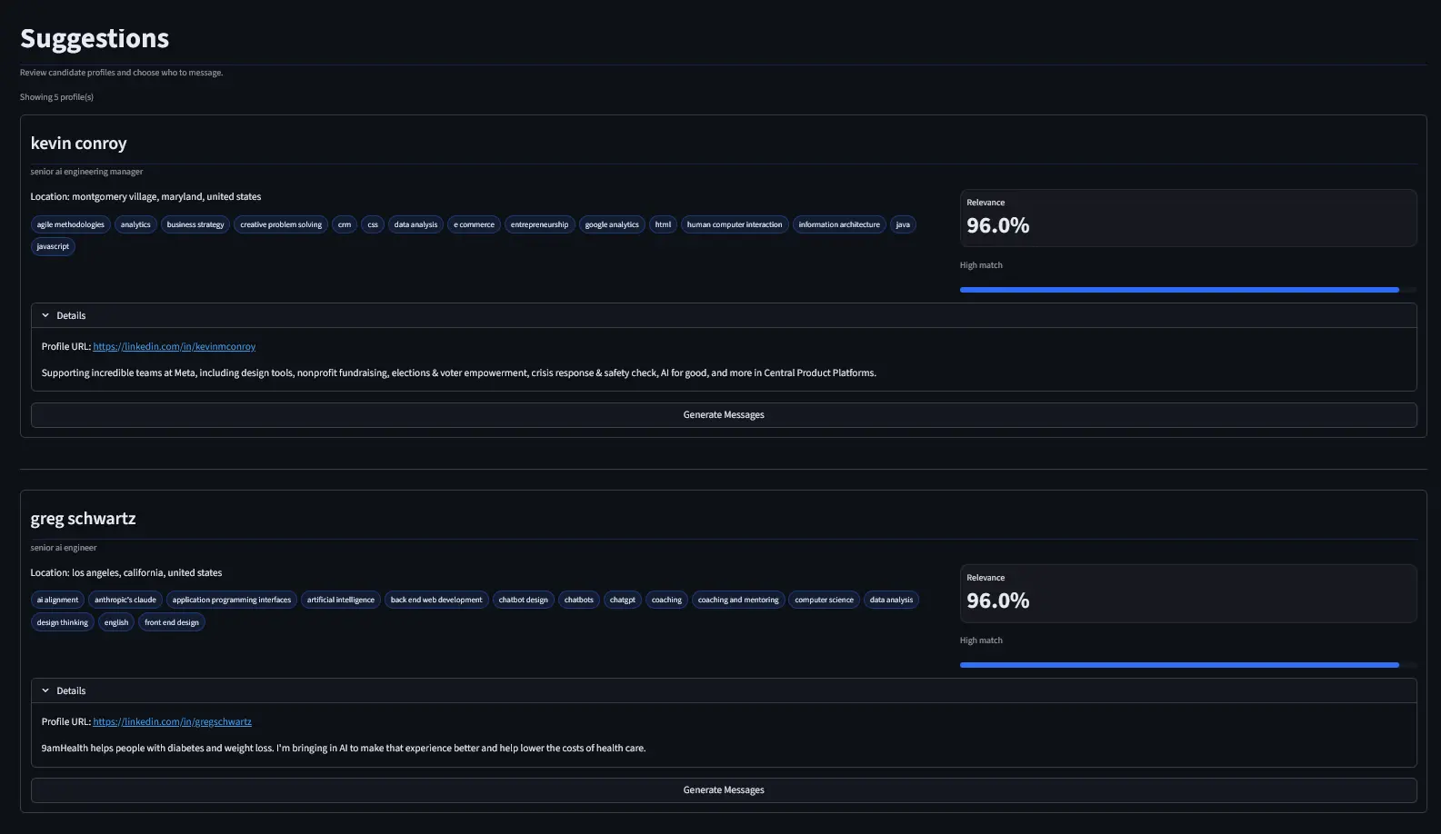 Candidates are scored for relevance and presented with skills, LinkedIn URLs, and enriched context — so you know exactly why each person was suggested.